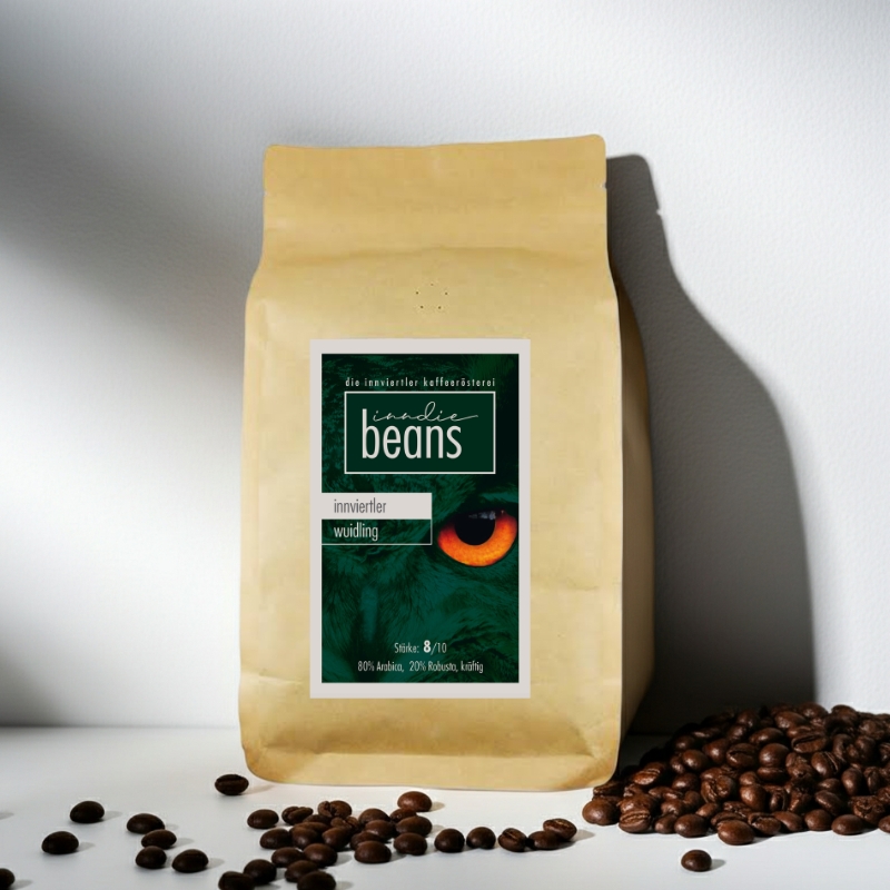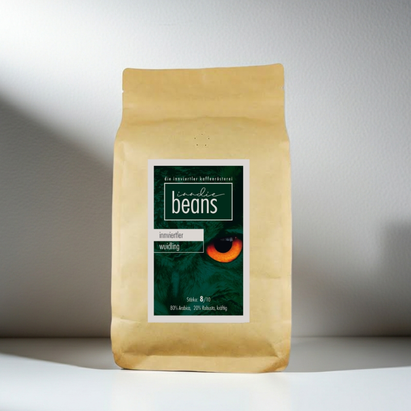 Der Innviertler Wuidling von Inndie Beans geht aromatisch in die würzige Richtung mit Noten nach Schokolade, Nüssen und einem rauchigen Touch im Abgang. Kräftig und säurearm, gut geeignet als Cappuccino.